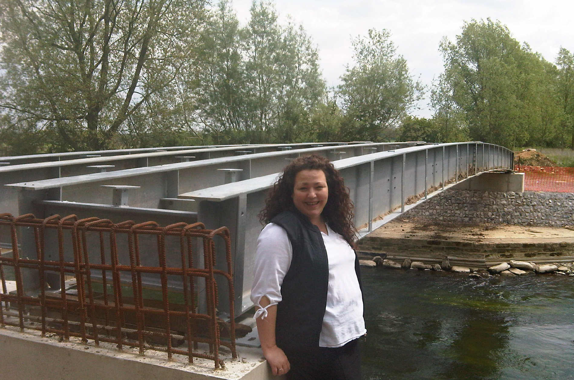 Rachel Causton by the new bridge over the river behind The Bell.